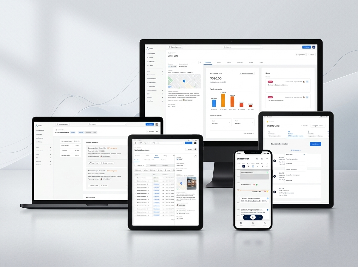 Field-service management platform that helps pest-control and environmental service companies manage inspections, quoting, scheduling, service execution, billing, and customer communication across mobile and web.